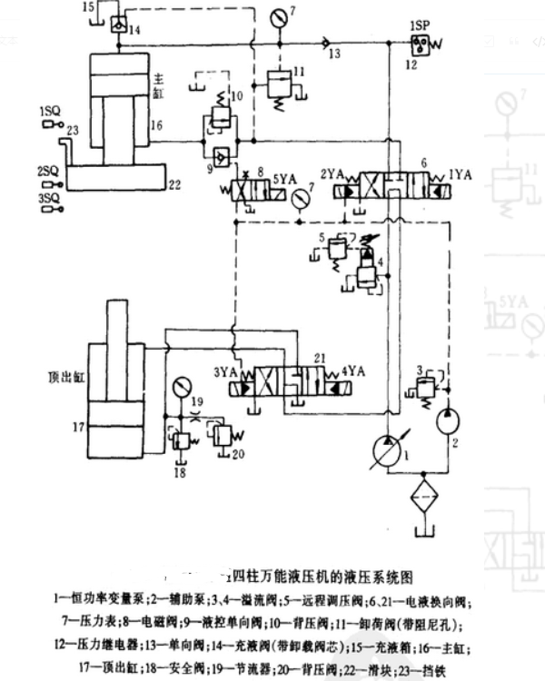 5、最后主缸停止時的狀態 ,當主缸滑塊上的鐵23按下沖程開關1SQ時,電磁鐵2YA被切斷,主缸活塞被位于M功能中心的閥門6鎖定,停止運動,返回行程結束。此時,泵1油通過閥門6,閥門21返回油箱,泵處于卸載狀態。在實際使用中,主汽缸可以在任何時候停下來。